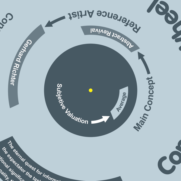 No time and need to write the review of an artist? Just turn the wheel, choose a generic concept that suits the work and thus automatically, this magic circle will give you an artist of reference and a concept development, you can also choose a subjective assessment by simply turning the top circle.
